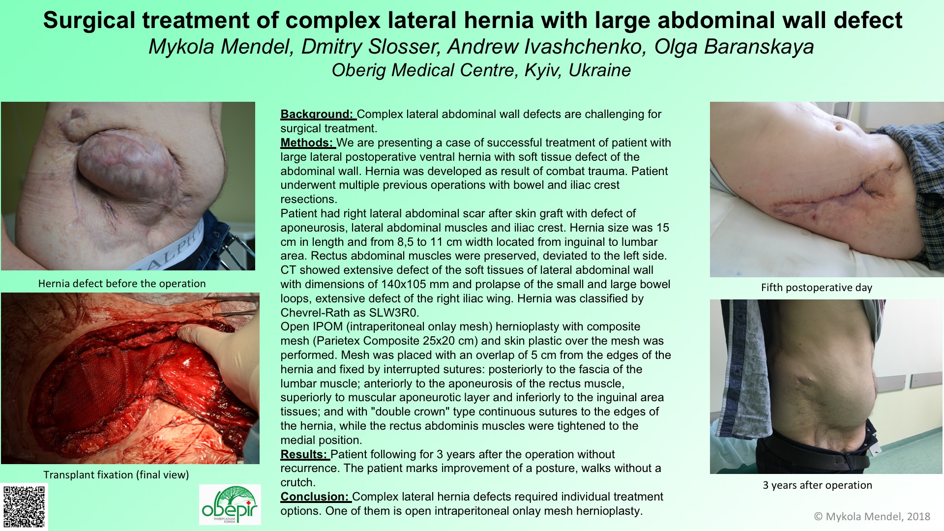Methods: We are presenting a case of successful treatment of patient with large lateral postoperative ventral hernia with soft tissue defect of the abdominal wall. Hernia was developed as result of combat trauma. Patient underwent multiple previous operations with bowel and iliac crest resections.